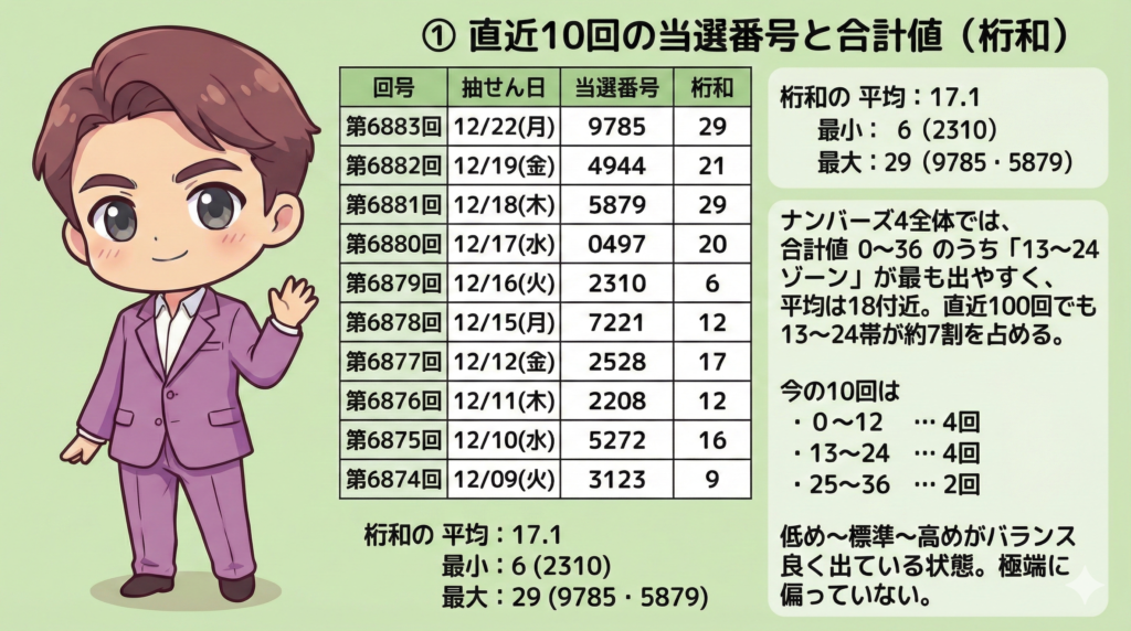 ① 直近10回の当選番号と合計値(桁和)