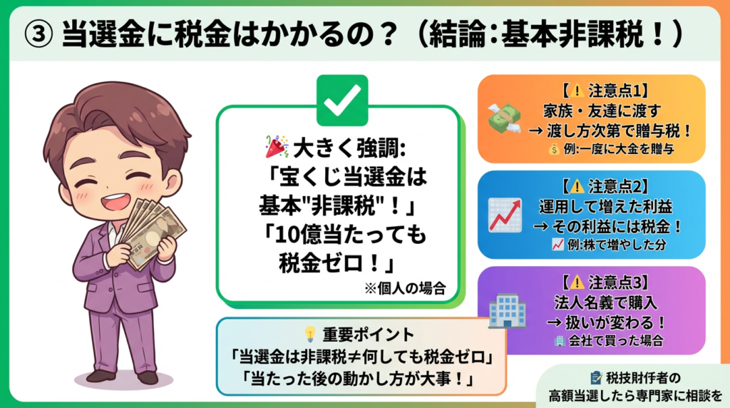 - 当選金そのものは基本非課税(個人)