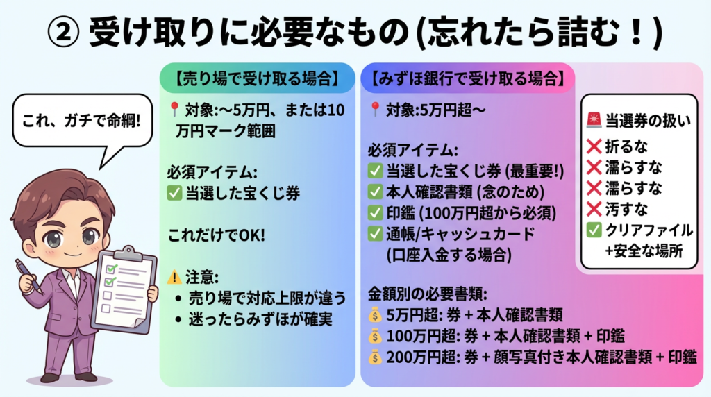 でも実は、当選金(当せん金)って「金額」で受け取り場所も必要なもんも変わるんよ。