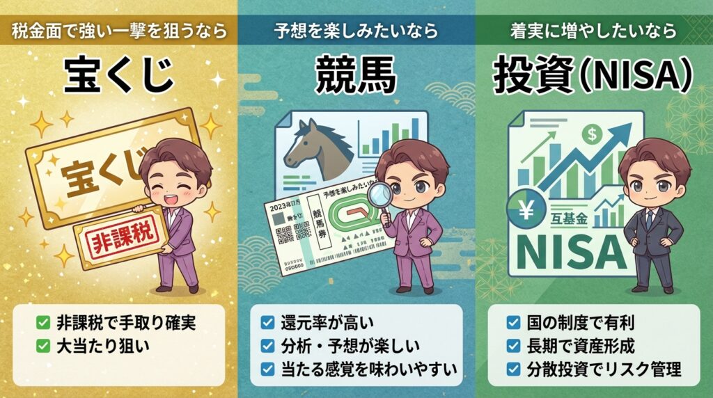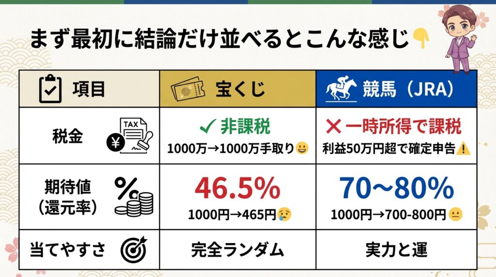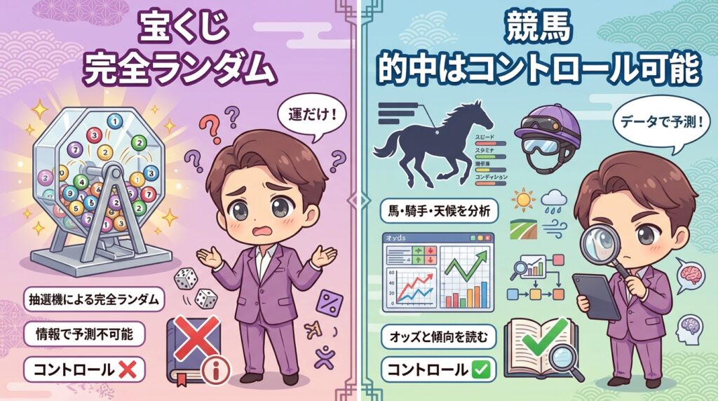 | 当てやすさ | 完全ランダム。一般的に小さい当たりはあるけど「大金」は超むずい | 予想・情報で“的中率”は上げやすいが、控除+税金でトータル勝つのは難しい |
