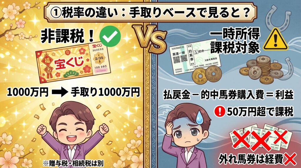 | 税金 | 当せん金は原則「非課税」|1000万当たったら基本そのまま1000万手元 | 原則「一時所得」扱いで課税対象|利益が50万円超えると確定申告の必要あり |