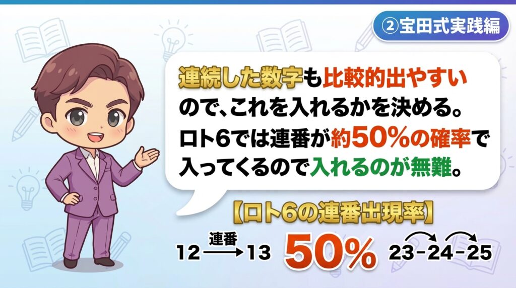 ロト6では連番が約50%の確率で入ってくるので入れるのが無難。