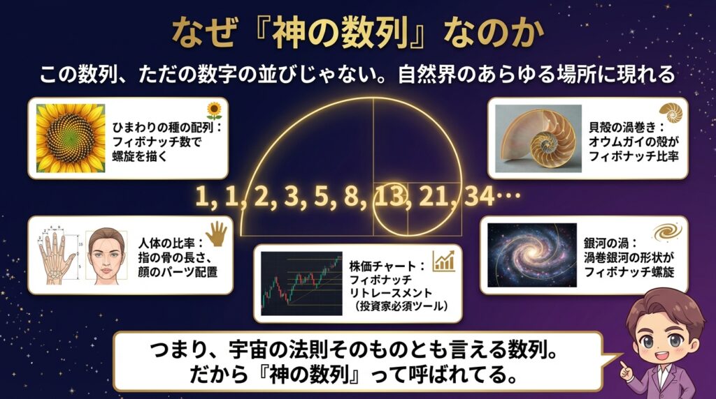 自然界に潜む神の数列とも呼ばれてて、ひまわりの種の配列、貝殻の渦巻き、銀河の形まで、この数列で説明できるって言われてる。
