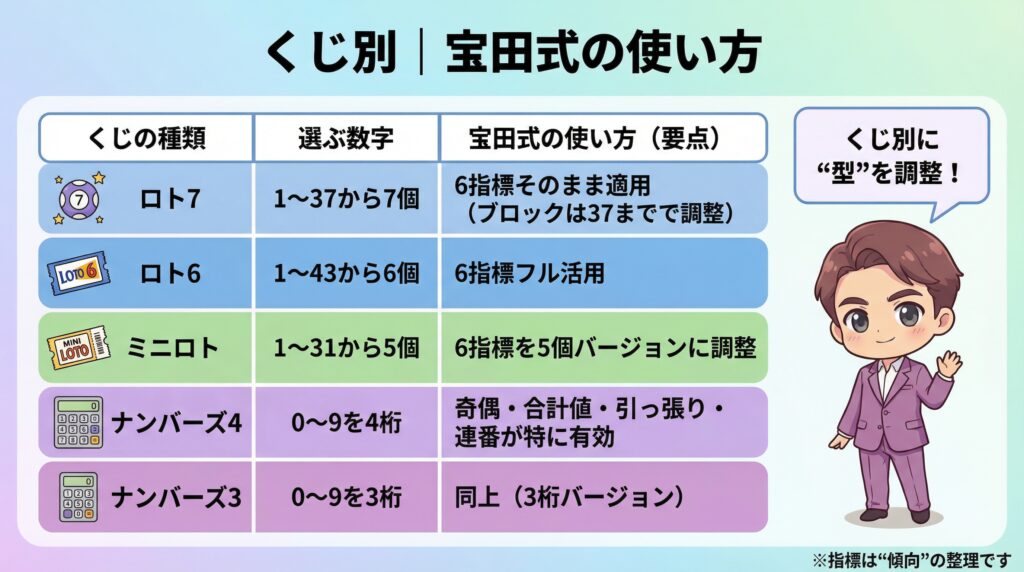 くじの種類によって数字の範囲や個数が変わるから、指標の数値は調整が必要やけど、フレームワークとしての宝田式は全部に使える。