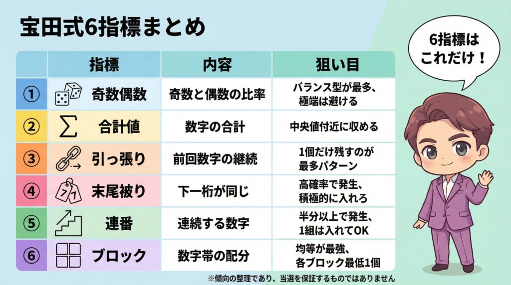 宝田式は、過去の当選数字を6つの指標で分解して、出現回数の多いパターンに寄せて数字を選んでいく分析手法や。