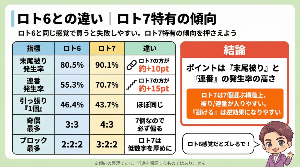 ロト7は7個選ぶから、被りや連番が入りやすい構造になっとる。 「被りを避ける」「連番を避ける」は、ロト7では致命的な間違いやで。