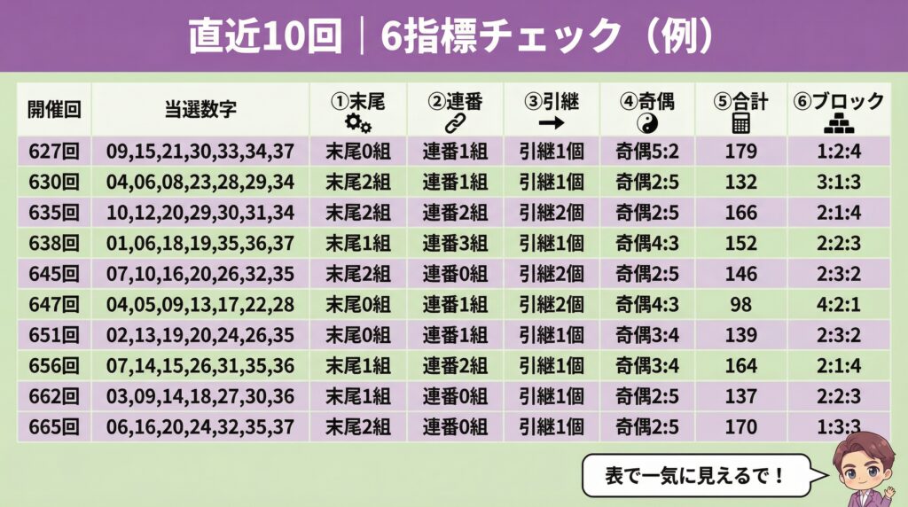 開催回当選数字①末尾②連番③引継④奇偶⑤合計⑥ブロック