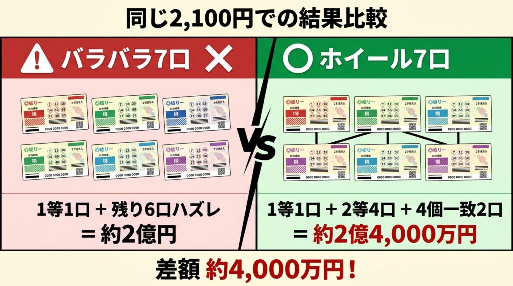 パターンB(バラバラ7口):1等1口(約2億円)+ 残り6口は全部ハズレ = 合計約2億円。