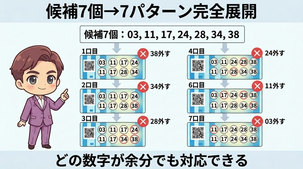 ロトホイール:「7個から6個を選ぶ全パターンを買う」→ 7口買う。38を外したバージョンも、34を外したバージョンも、28を外したバージョンも、全部ある。どの数字が”余分”やったとしても、それを外したパターンが必ず含まれてるから取りこぼさへん。