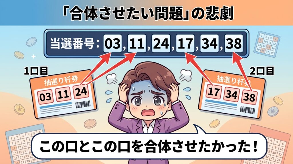 バラバラの口に振り分けてた数字を全部1口にまとめてたら──6個全部一致してたやん!! っていうやつ。