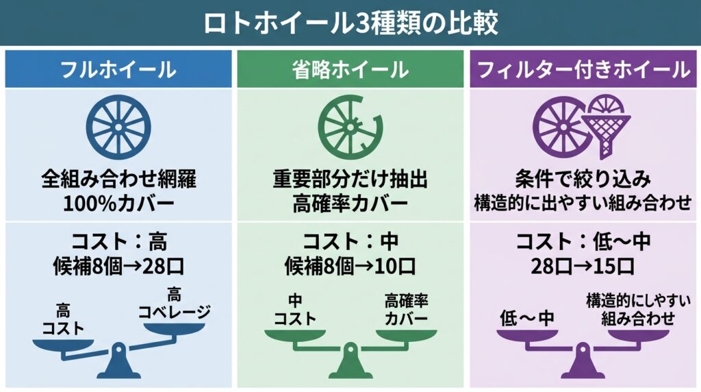 ホイールを使っても確率自体は変わらへん。宝くじの期待値は常にマイナス。ホイールは魔法やない。「同じ予算での最適化」にすぎひん。