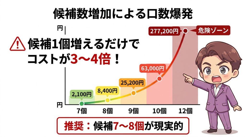 A. ロト6なら7個(7口=2,100円)、ロト7なら8個(8口=2,400円)がスイートスポット。候補が1個増えるだけで口数が爆発するから、個人予算なら7〜8個が現実的。予算に余裕があれば候補8個のフルホイール(ロト6で28口=8,400円)も視野に入るで。