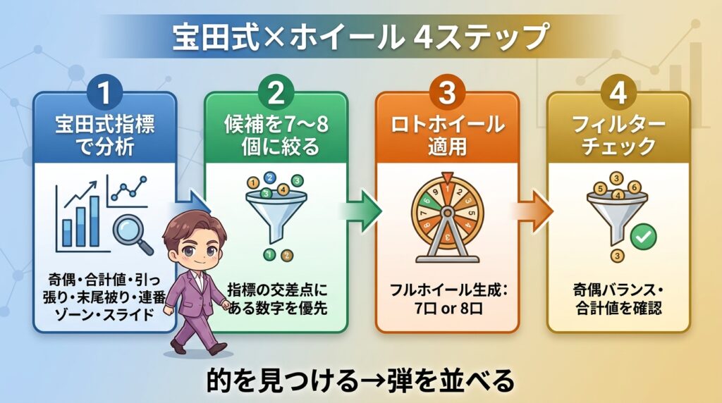 A. 宝田式の指標(奇偶バランス・合計値・引っ張り・末尾被り・連番・ゾーン・スライド)で候補数字を7〜8個に絞り、その候補にロトホイールを適用するのが基本の流れ。指標が「どの数字を選ぶか」を担当し、ホイールが「選んだ数字をどう組み合わせるか」を担当する。この2つが噛み合った時が、同じ予算で最も効率のいい買い方になるで。