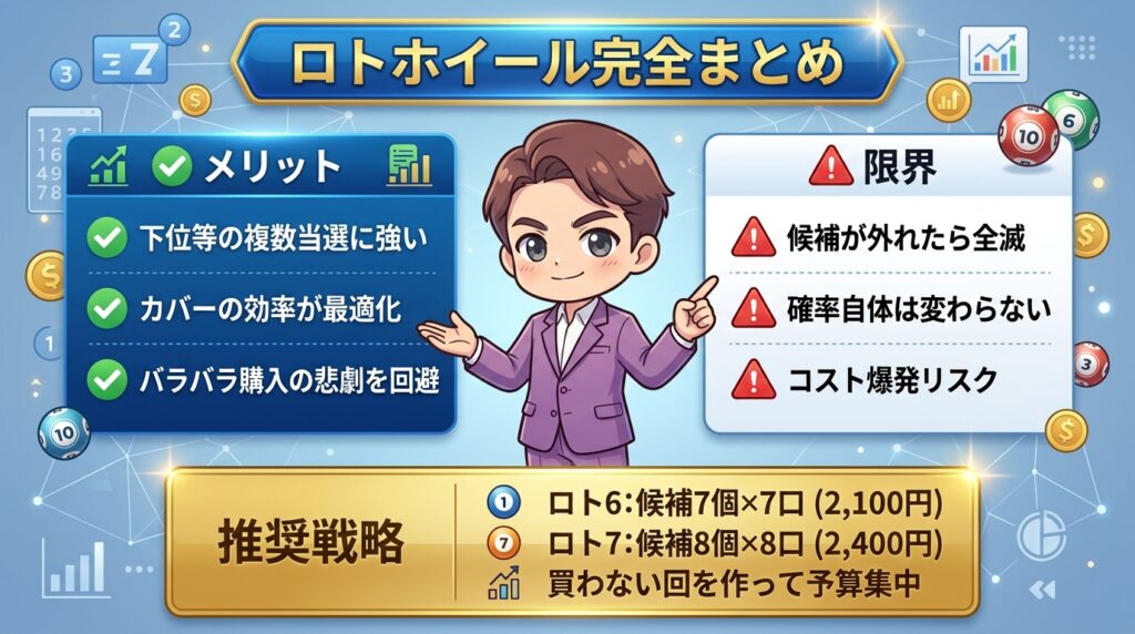 特にロト7の候補8個=フルホイール8口(2,400円)は、コストと効果のバランスが良くて現実的。ロト6でも候補7個の7口(2,100円)は十分射程圏内や。月1回、予算を集中すれば普通の娯楽費で回せるレベルやねん。